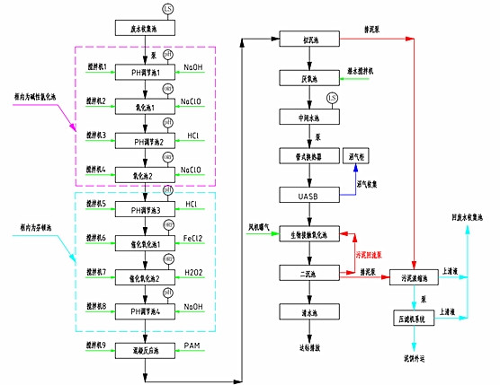 污水先PH調(diào)節(jié)池,然后在經(jīng)過氧化池,這樣來回的重復(fù)幾個流程,在進(jìn)入PAM反應(yīng)池,然后經(jīng)過沉淀,使排放出去的水能夠達(dá)標(biāo)。其具體的流程圖如下。